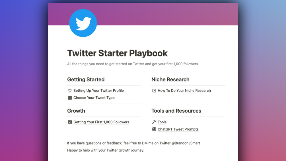 Looking to Grow on Twitter in 2023? I've created a Twitter Starter Playbook to help you get your first 1,000 followers quickly. It has EVERYTHING you need.